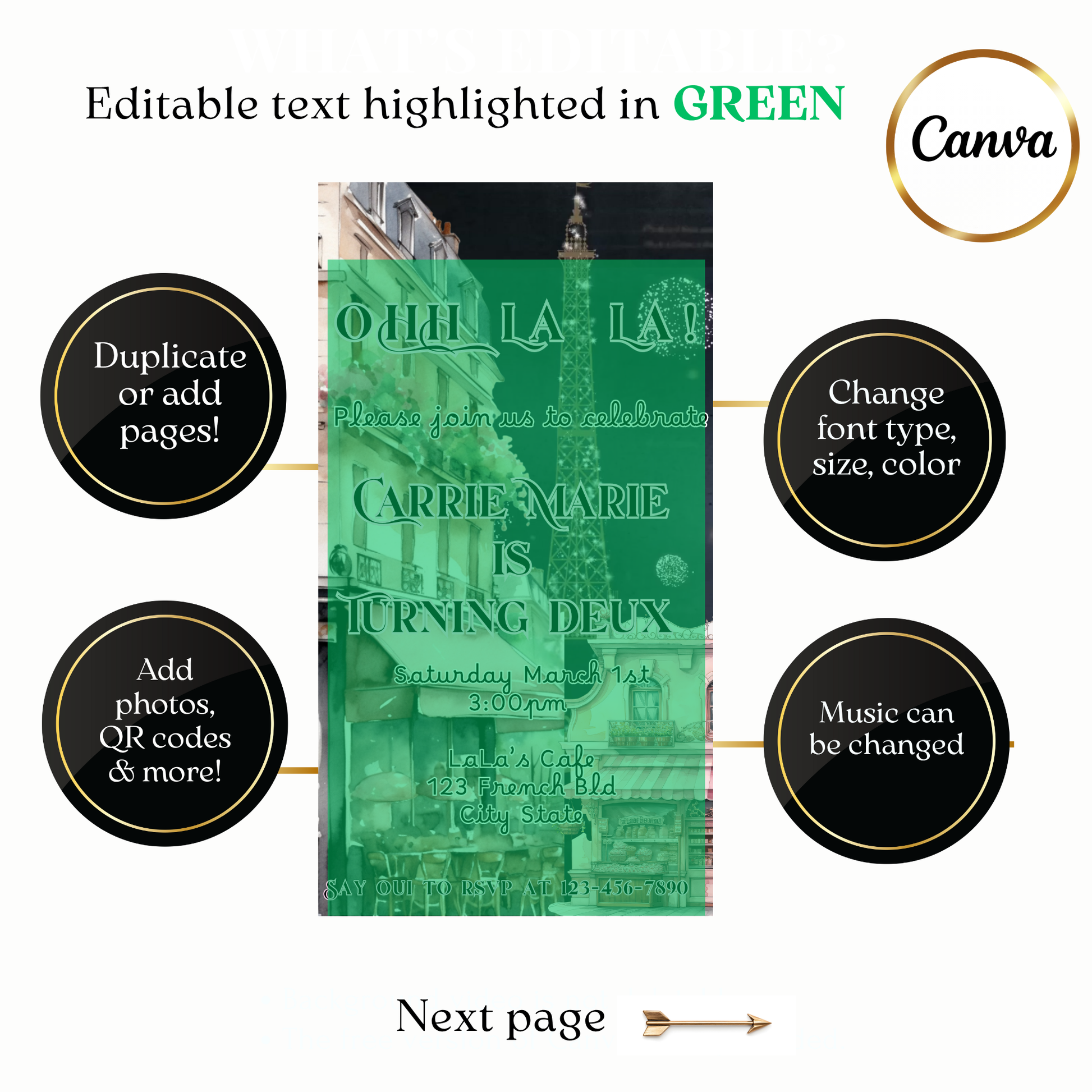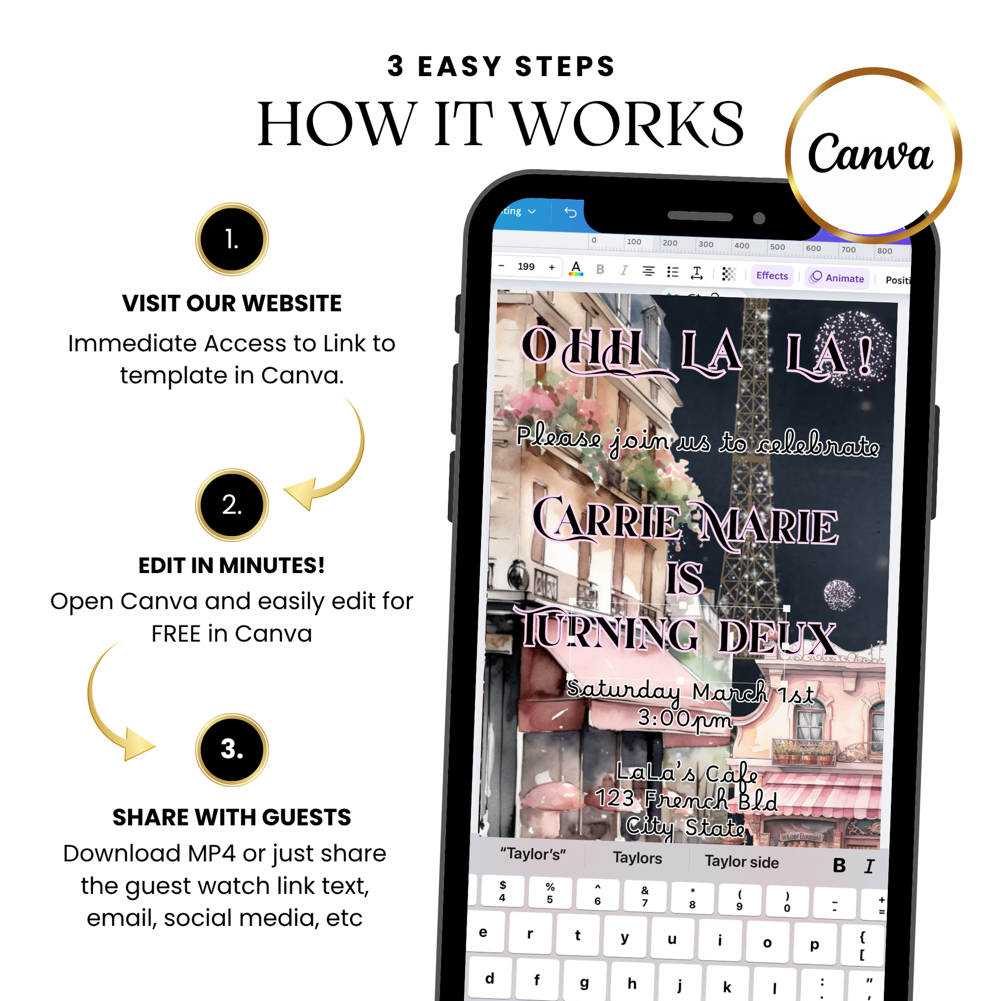 🇫🇷✨ Step into a glamorous Parisian celebration with this elegant Eiffel Tower Animated Video Invitation! Featuring a sparkling Eiffel Tower, dreamy Parisian skyline, and chic modern design, this editable digital invite is perfect for Paris-themed birthdays, bridal showers, bachelorette parties, sweet 16s, quinceañeras, and sophisticated soirées! Personalize it with your event details and instantly share via text, email, or social media!