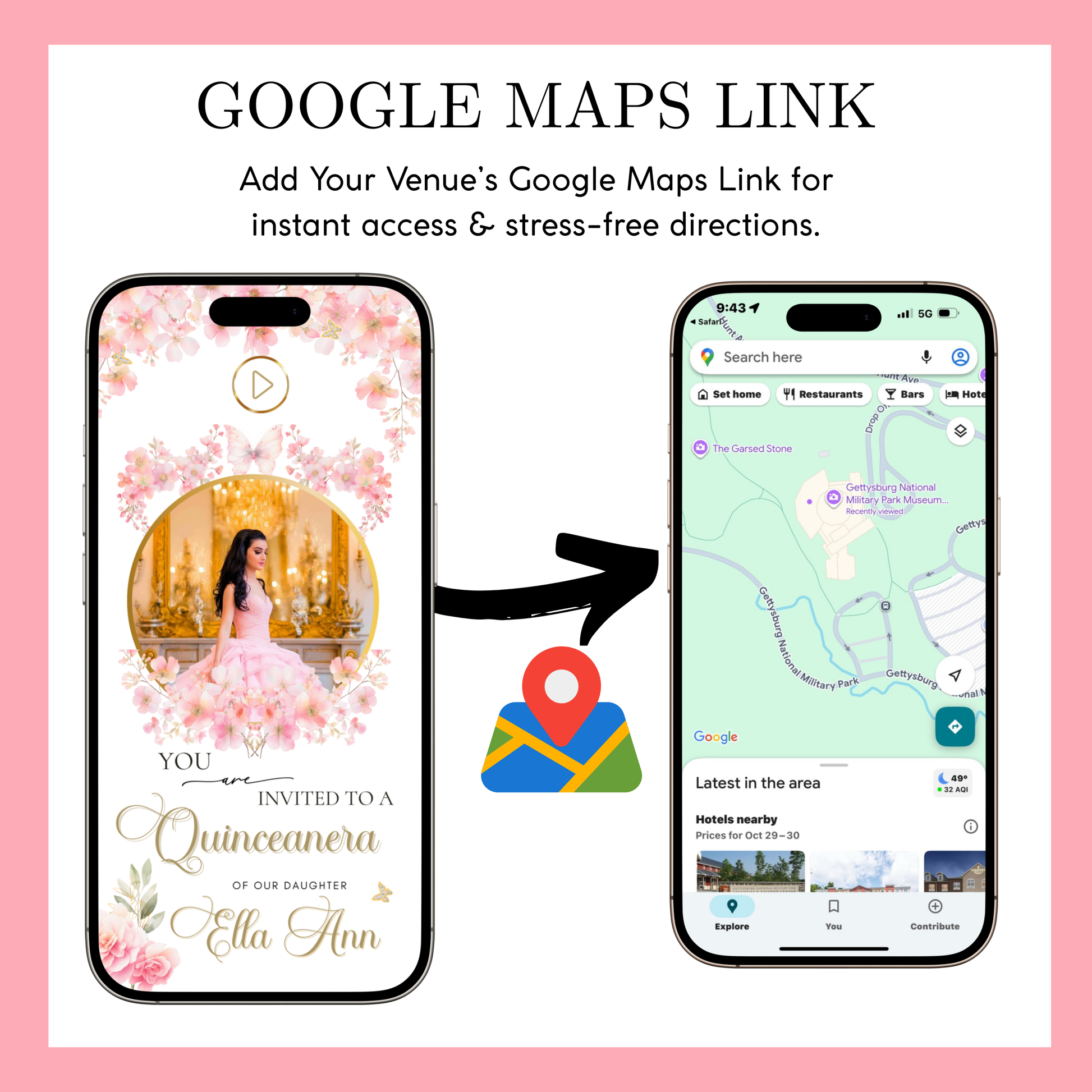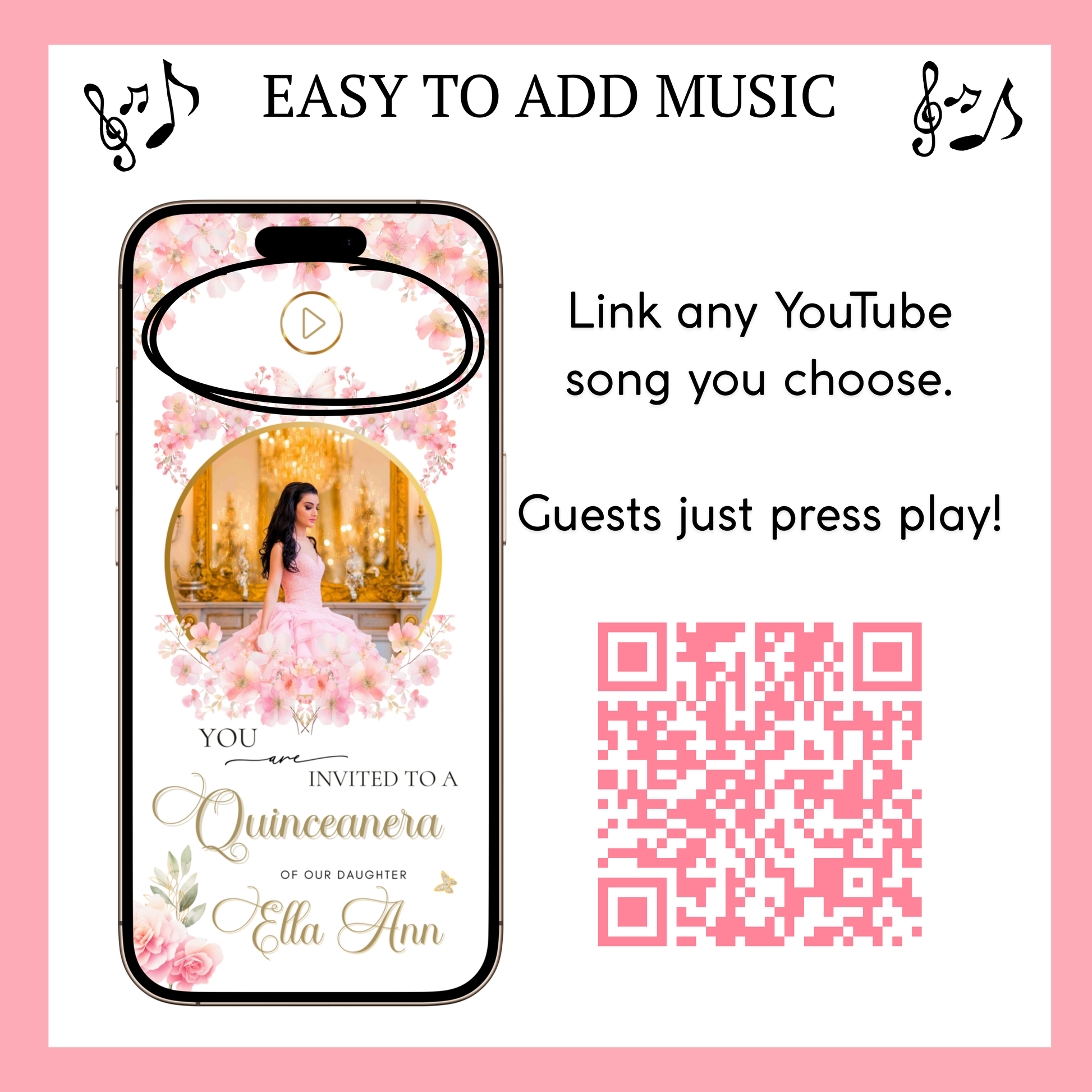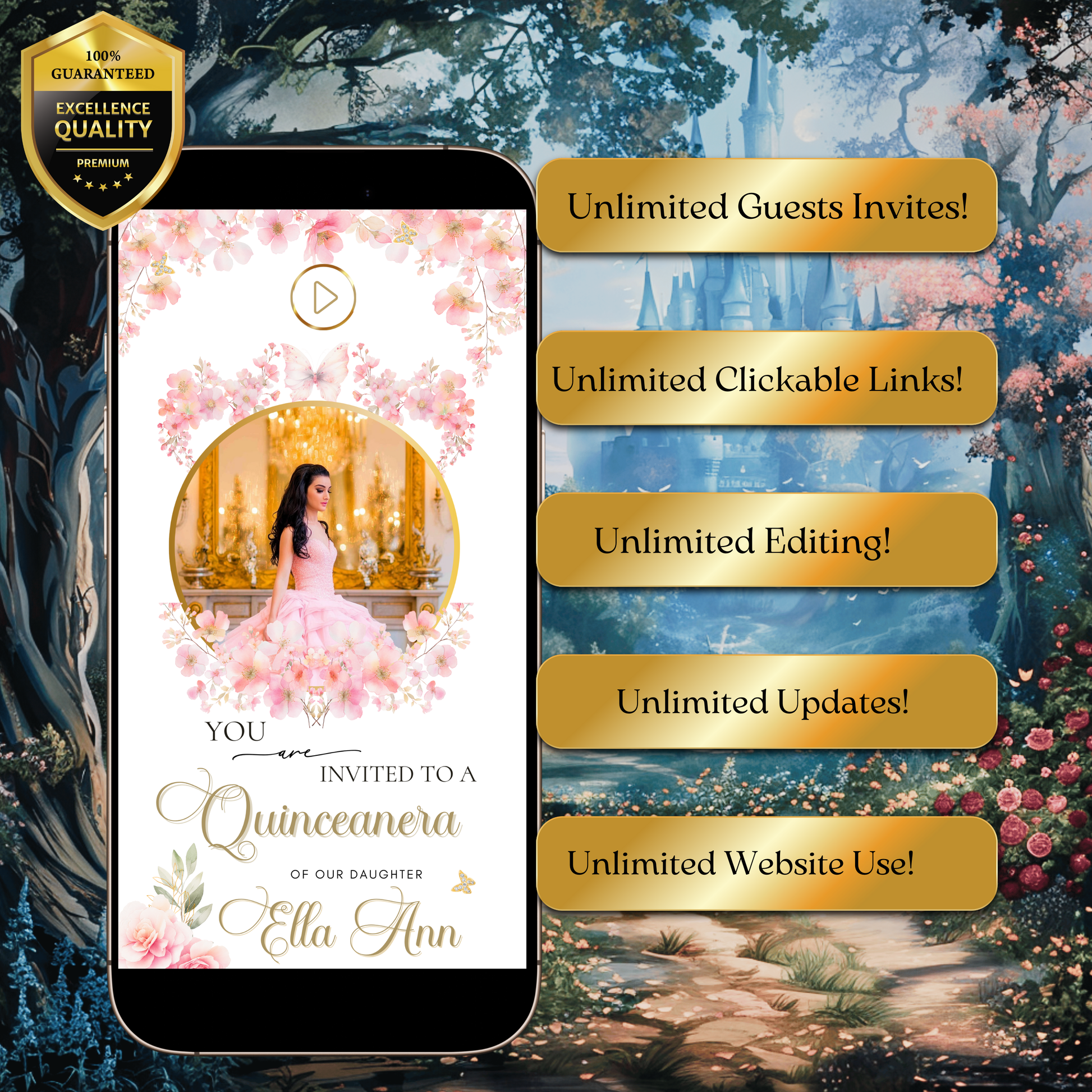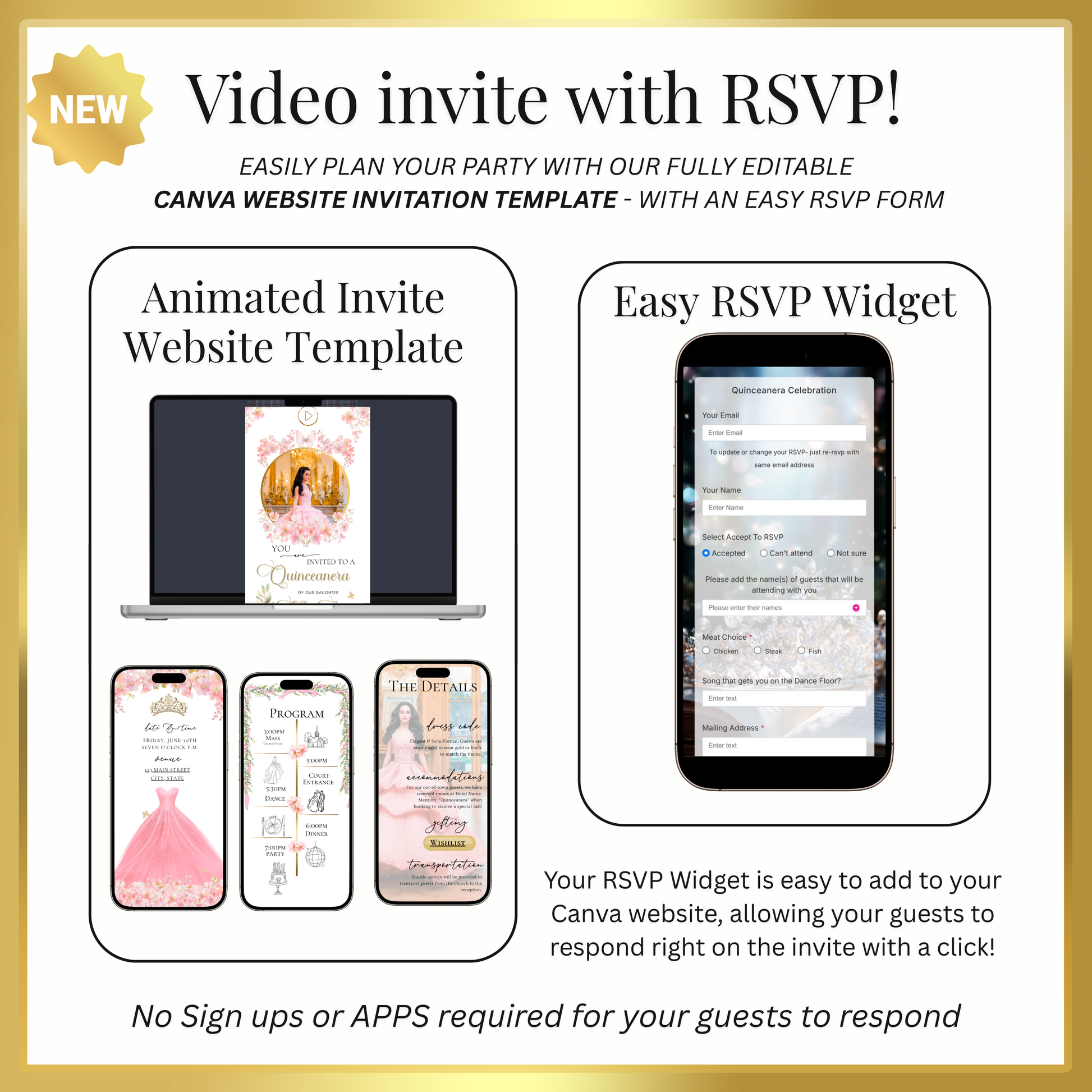 Pink Floral Quinceanera Website Invite | Sweet 15 16 Evite RSVP Video Invitation | Canva Template