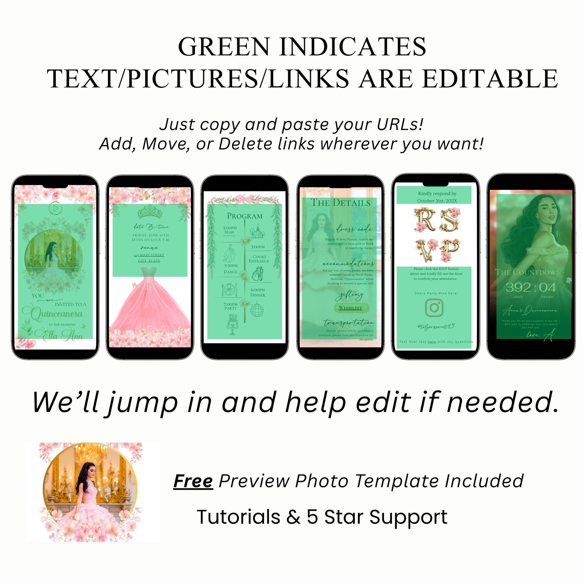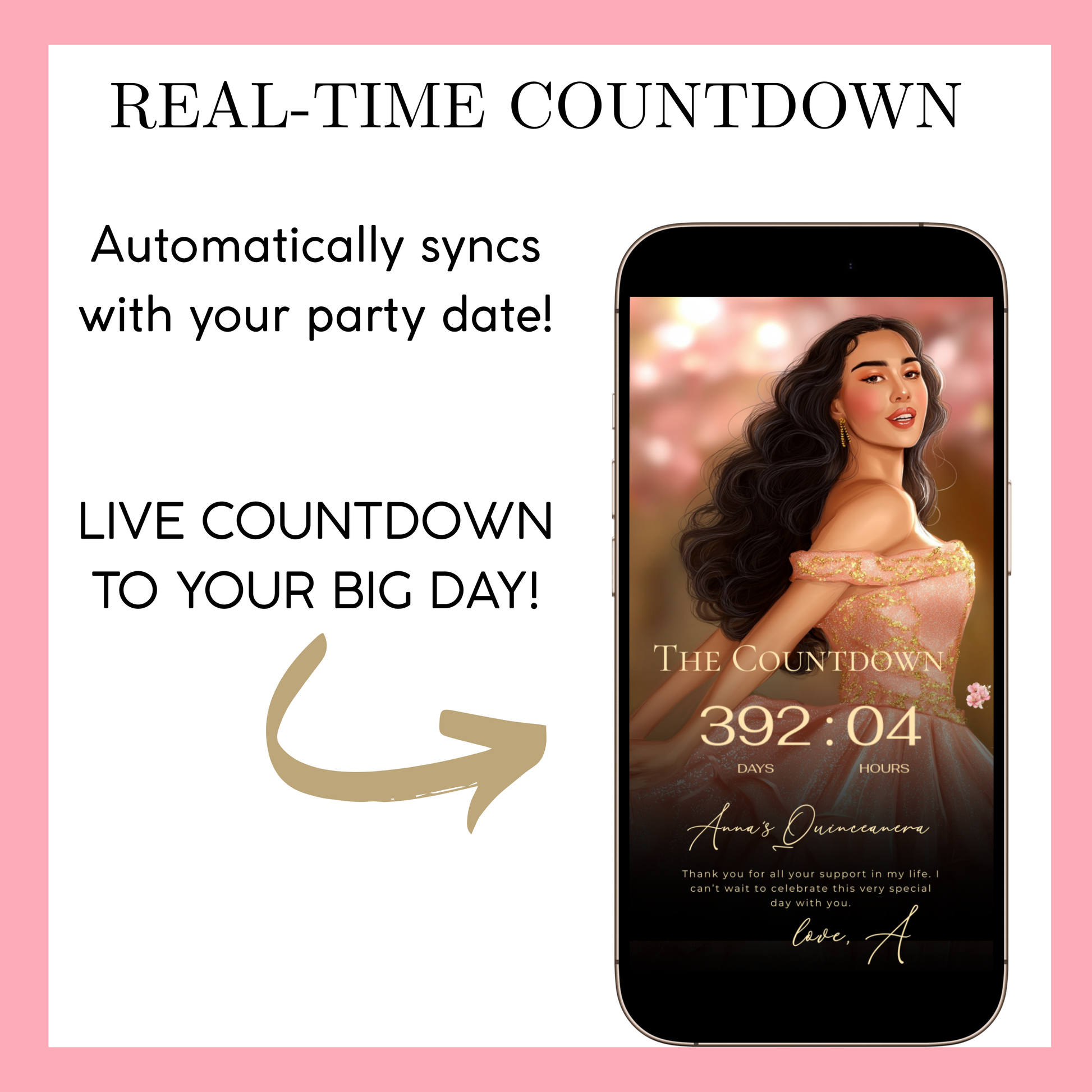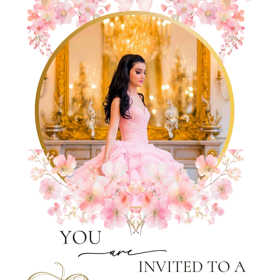 Mark your Quinceañera (sweet 15) or Sweet 16 in unforgettable style with this Pink Princess inspired Royal video website invitation. This beautifully designed Pink and White video invitation comes with glamorous gold accents and elegant floral details and clickable links to all important event details. This editable digital template allows you to personalize every page with your own photos, music, and event information, creating a one-of-a-kind invitation that reflects your special day.