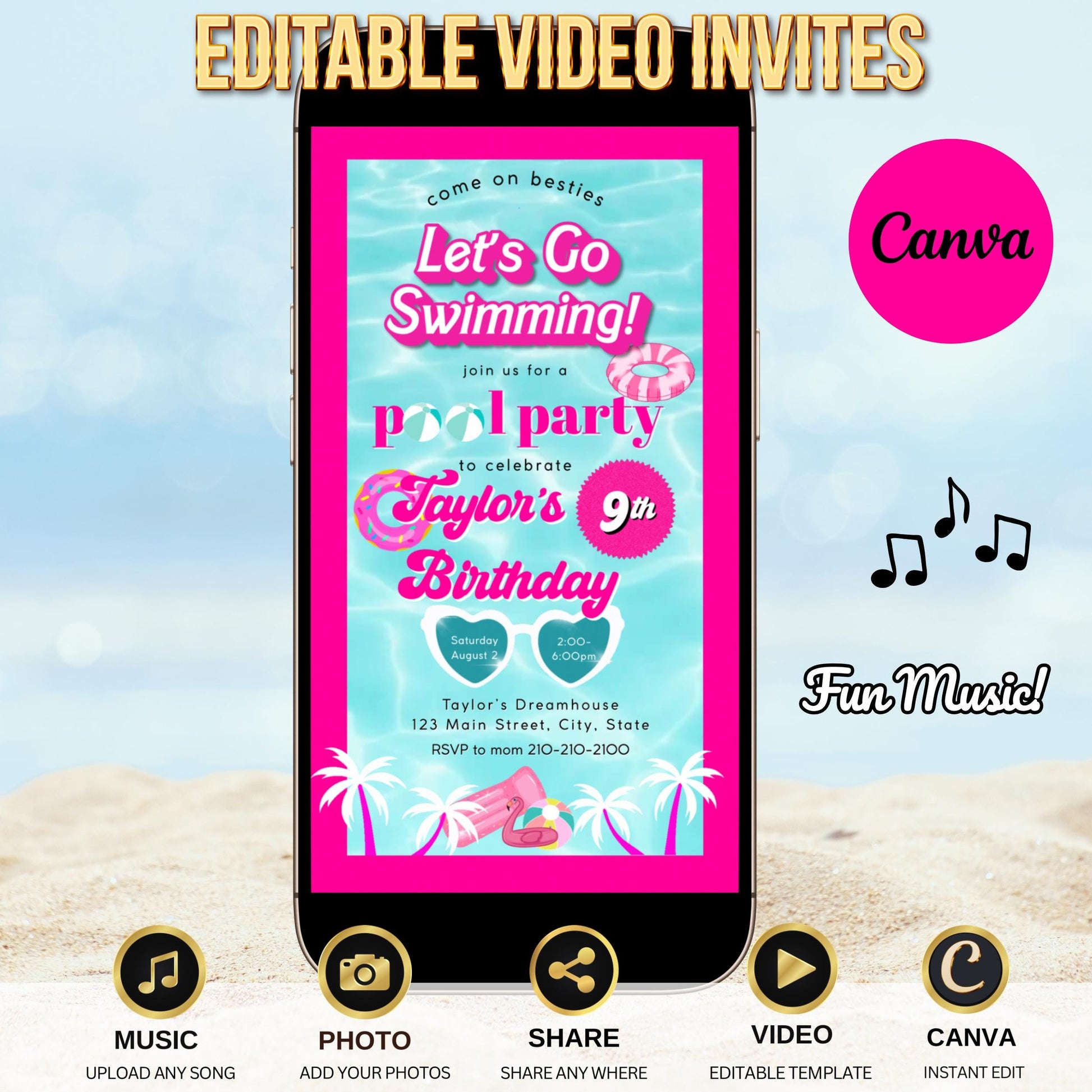 • Editable pink pool party video invitation with chic beach vibes