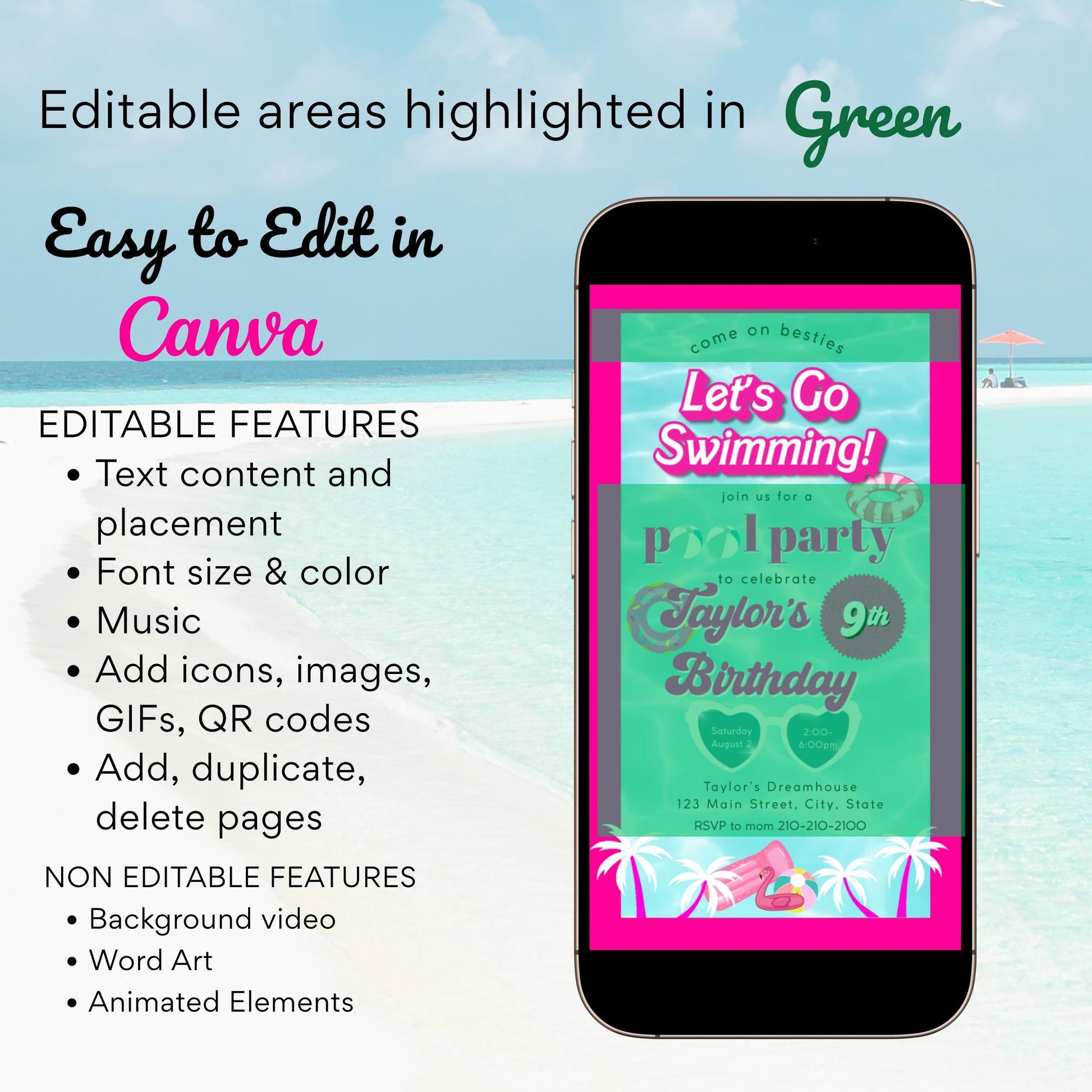 Make a splash with this Pink Pool Party Editable Video Invitation, perfect for summer birthdays, sweet 13th celebrations, or any poolside bash! Featuring a chic pink lifebuoy, beachy watercolor background, and editable music option, this editable digital invite is designed for easy customization.