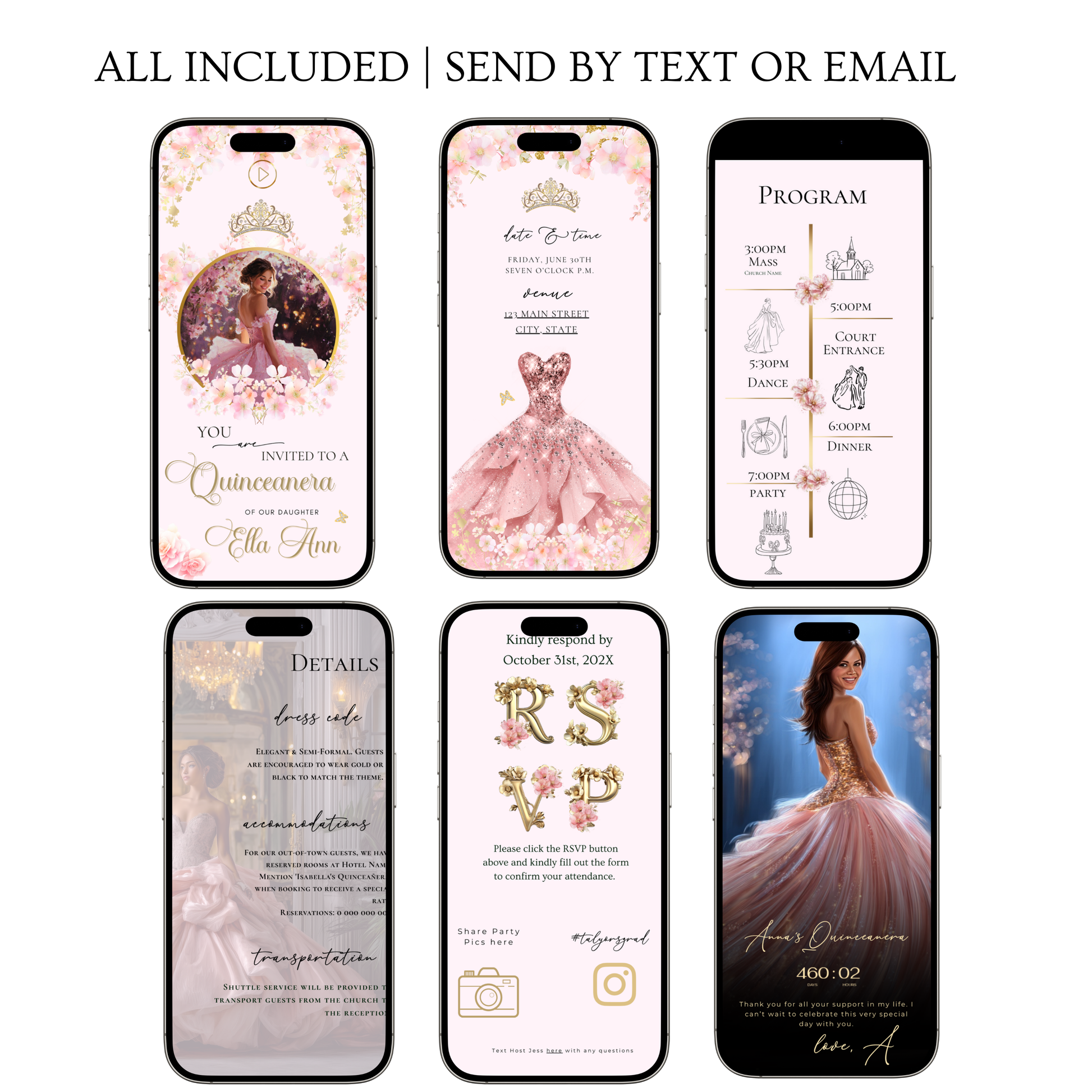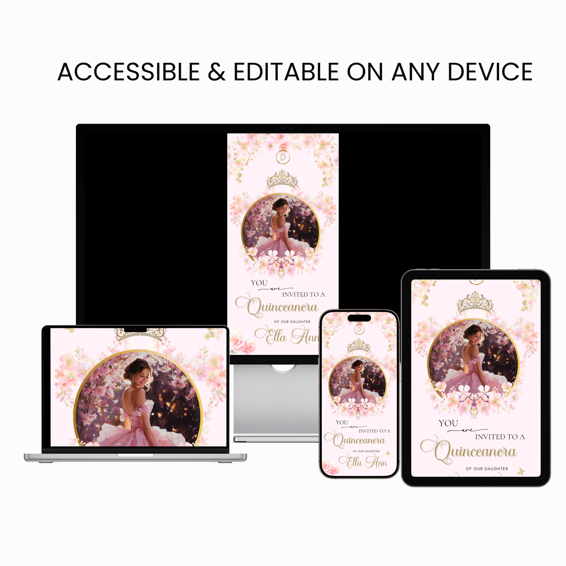 Mark your Quinceañera (sweet 15) in unforgettable style with this pink and gold floral video website invitation. This beautifully designed video invitation comes with glamorous gold accents and elegant floral details and clickable links to all important event details. This editable digital template allows you to personalize every page with your own photos, music, and event information, creating a one-of-a-kind invitation that reflects your special day.