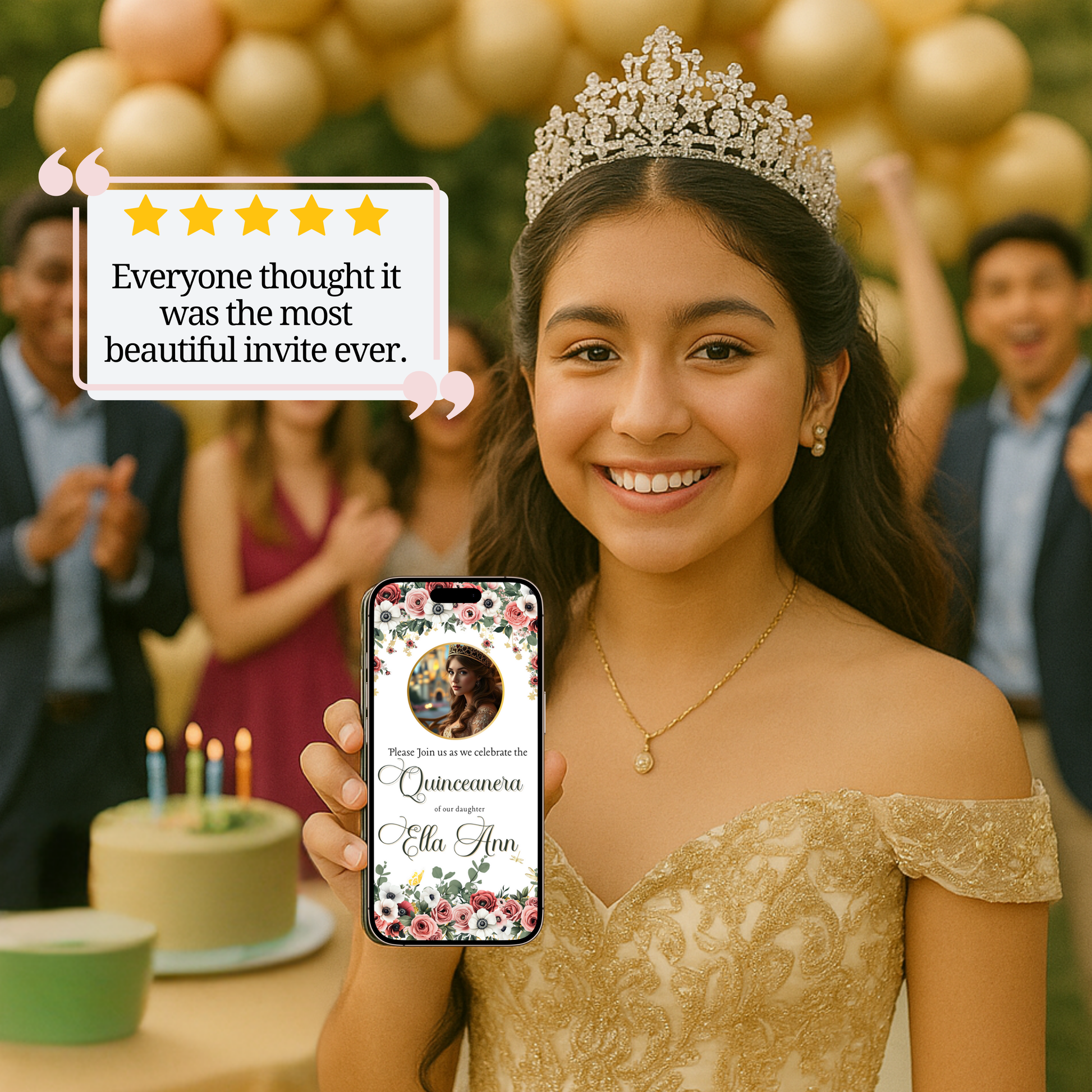 Blush Floral Quinceanera Video Invite Animated Sweet 15 Quince Mobile Evite with RSVP tracking