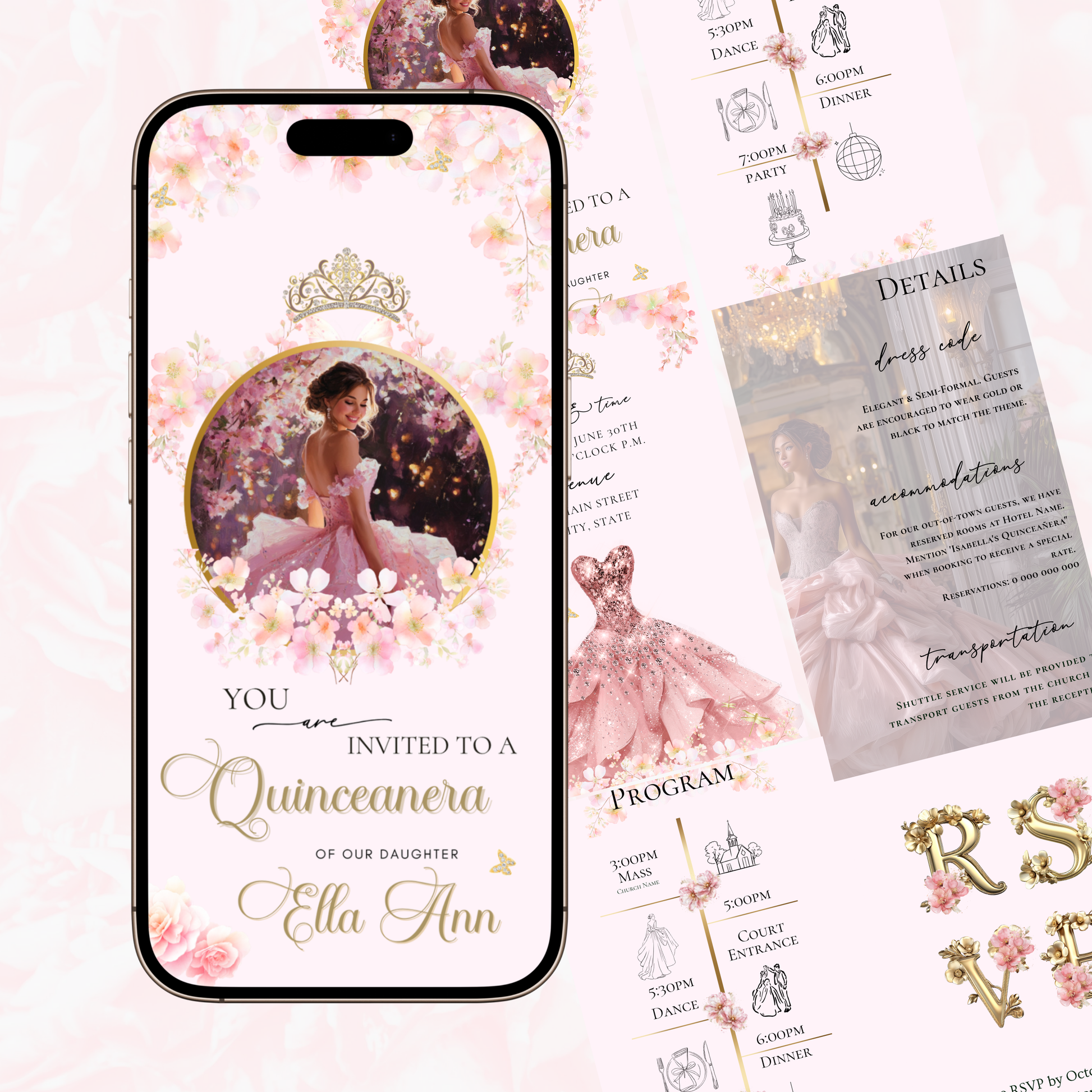 Pink Quinceanera Video Invite Animated Sweet 15 Quince Mobile Evite with RSVP and Music