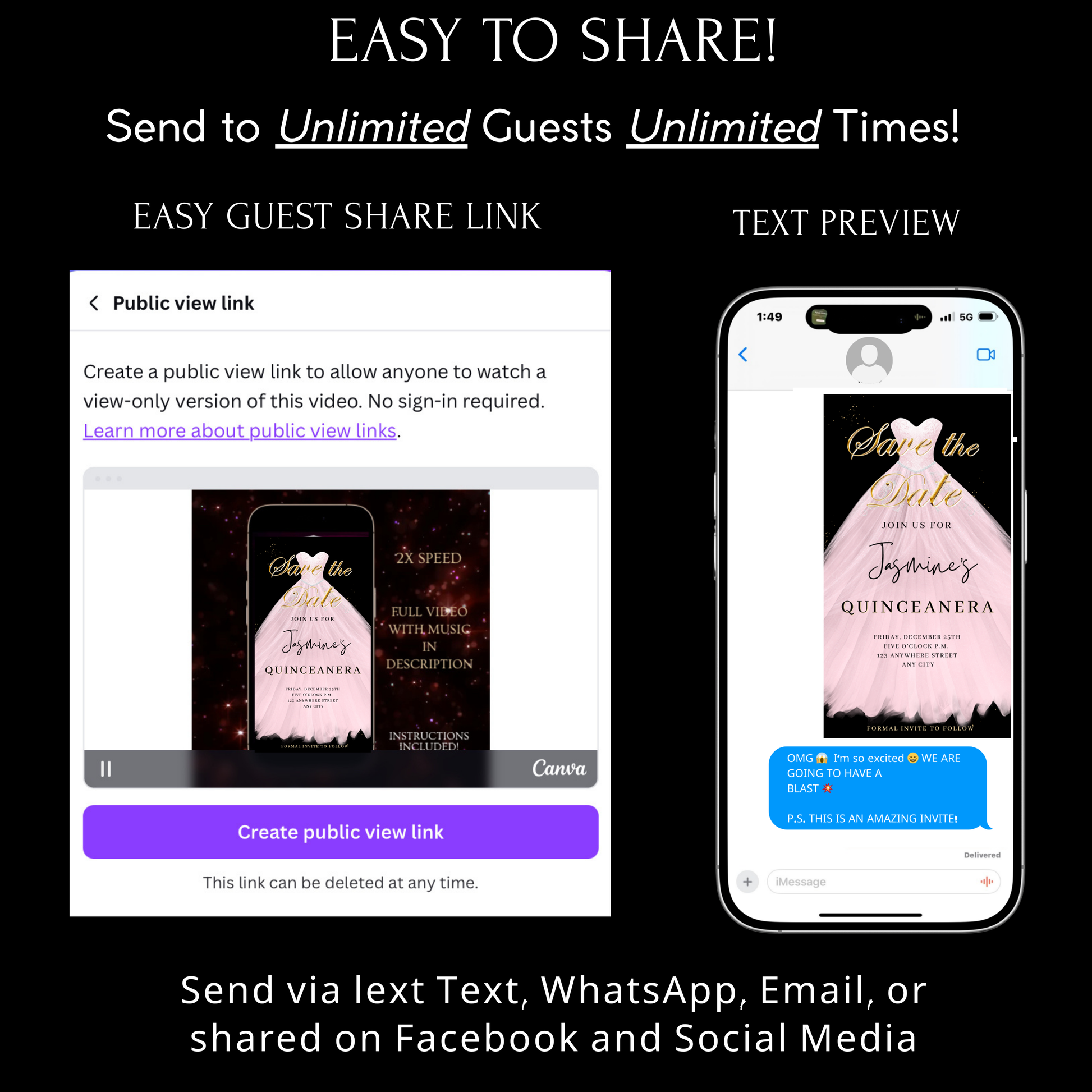 Share your video invitation or the interactive websiteby text, email, WhatsApp, or social media.
