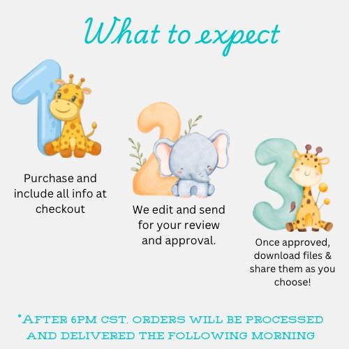 Congratulations! A Personalized Pregnancy Announcement is a special and memorable way to announce your little one’s arrival. We edit this special invitation for you and you'll receive your digital announcement within a few hours of purchase!.