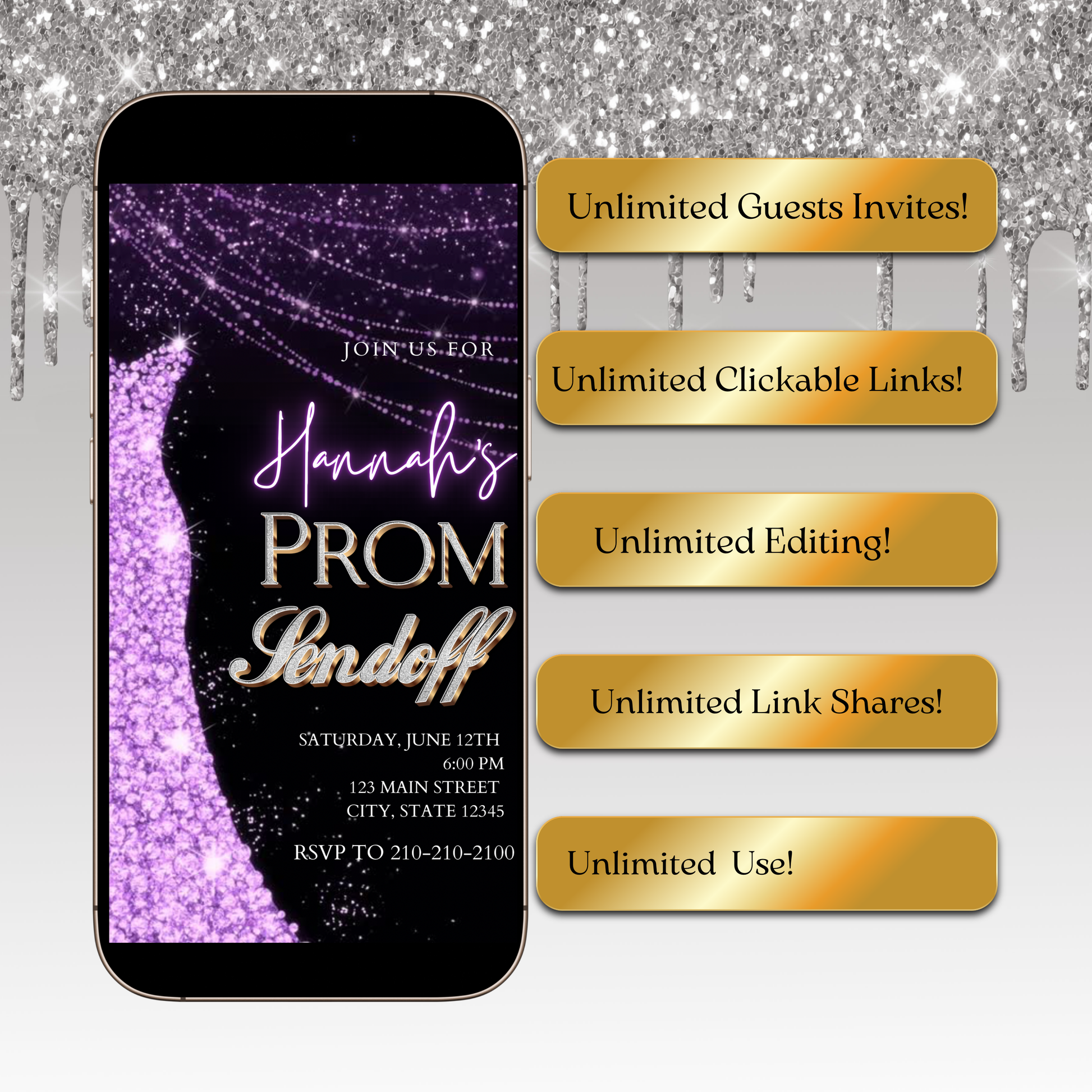 Celebrate your special event in unforgettable style with this Purple Gold Glam Prom Send Off Video Invitation! This animated, editable Canva video invitation is designed in a mobile-first vertical format and is perfect for sharing by text, email, or social media.