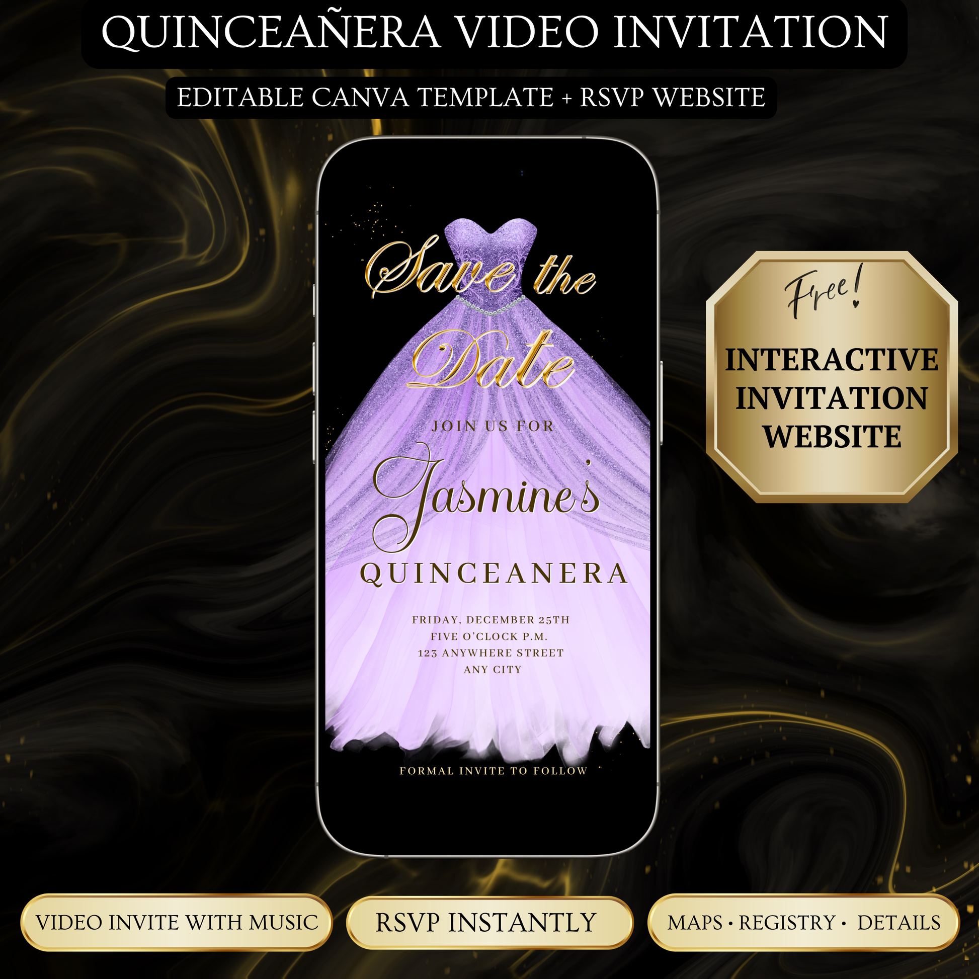 Purple Quinceanera Video Invite | Sweet 15 16 Quince RSVP Tracker | Editable Canva Evite Template