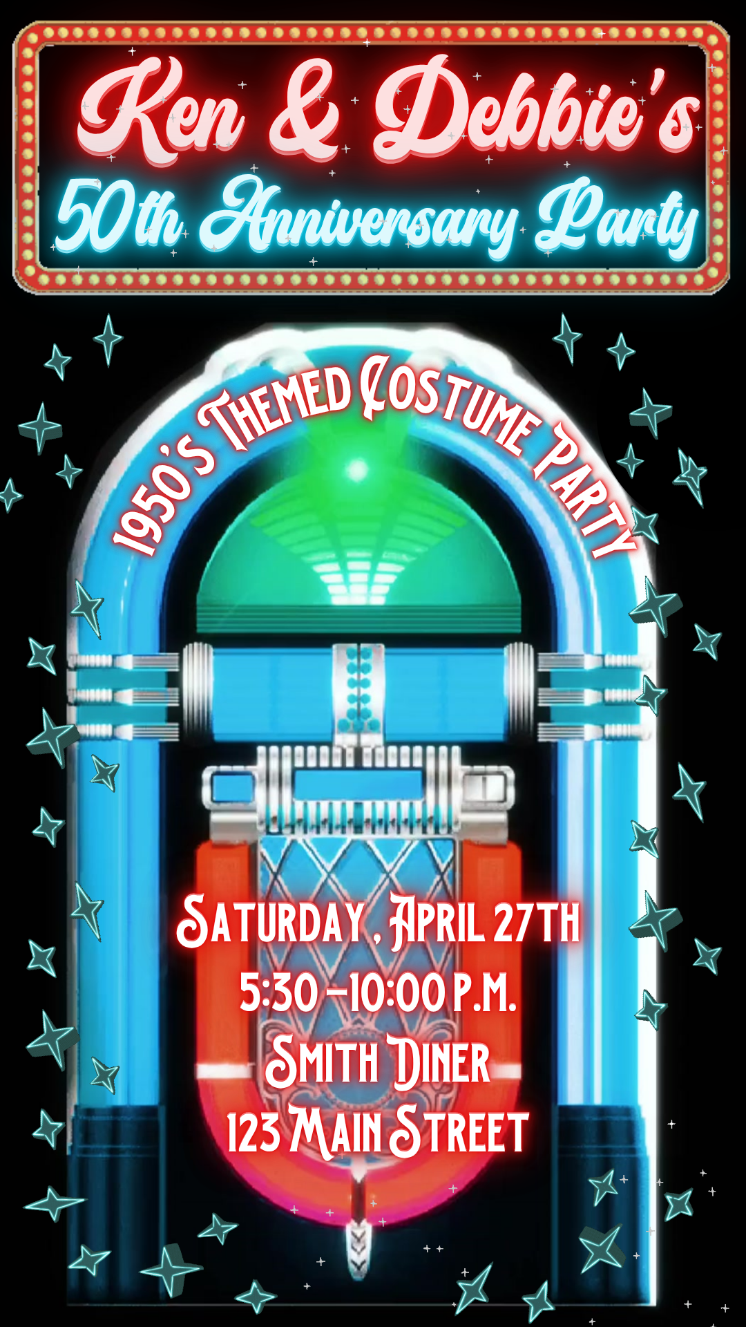 Deliver instant impact with this rockabilly 1950s themed party video invitation | retro jukebox anniversary evite. Edit online, export, and send within minutes — a modern, mobile-first invitation that looks amazing on every screen.
