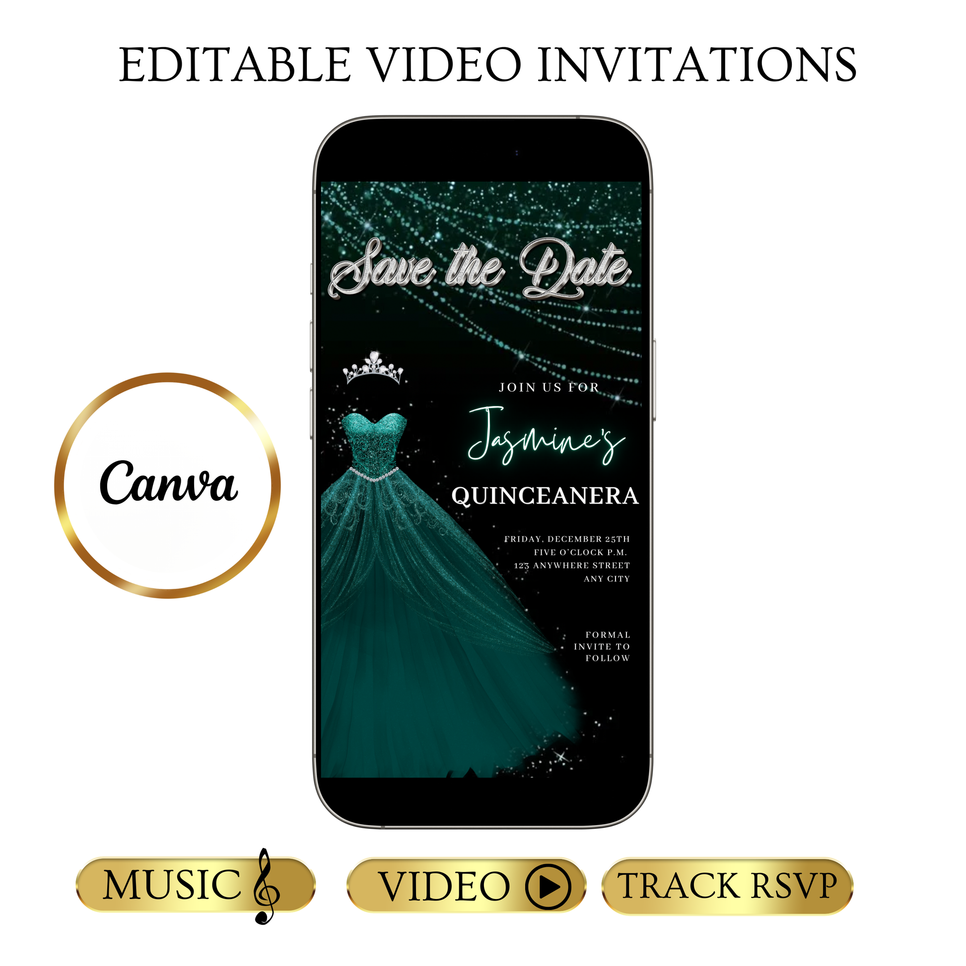Teal Green Quinceanera Video Invite | Sweet 15 16 Quince RSVP Tracker | Editable Save the Date Canva Evite Template