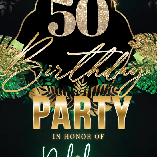 Celebrate turning 50 in unforgettable style with this Tropical Green Gold 50th Birthday Video Invitation! This animated, editable Canva video invitation is designed in a mobile-first vertical format and is perfect for sharing by text, email, or social media.