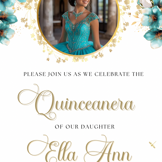 Celebrate your Sweet 15 in style with this luxurious, beautiful, and elegant Turquoise and Gold Princess Quinceañera Video Invitation RSVP tracker! This multi-page digital template allows you to personalize it with your own photos, event details, and elegant gold design elements. Perfect for a modern yet traditional quinceañera, this invite adds a touch of elegance while being easy to customize and share via text, email, or social media!
