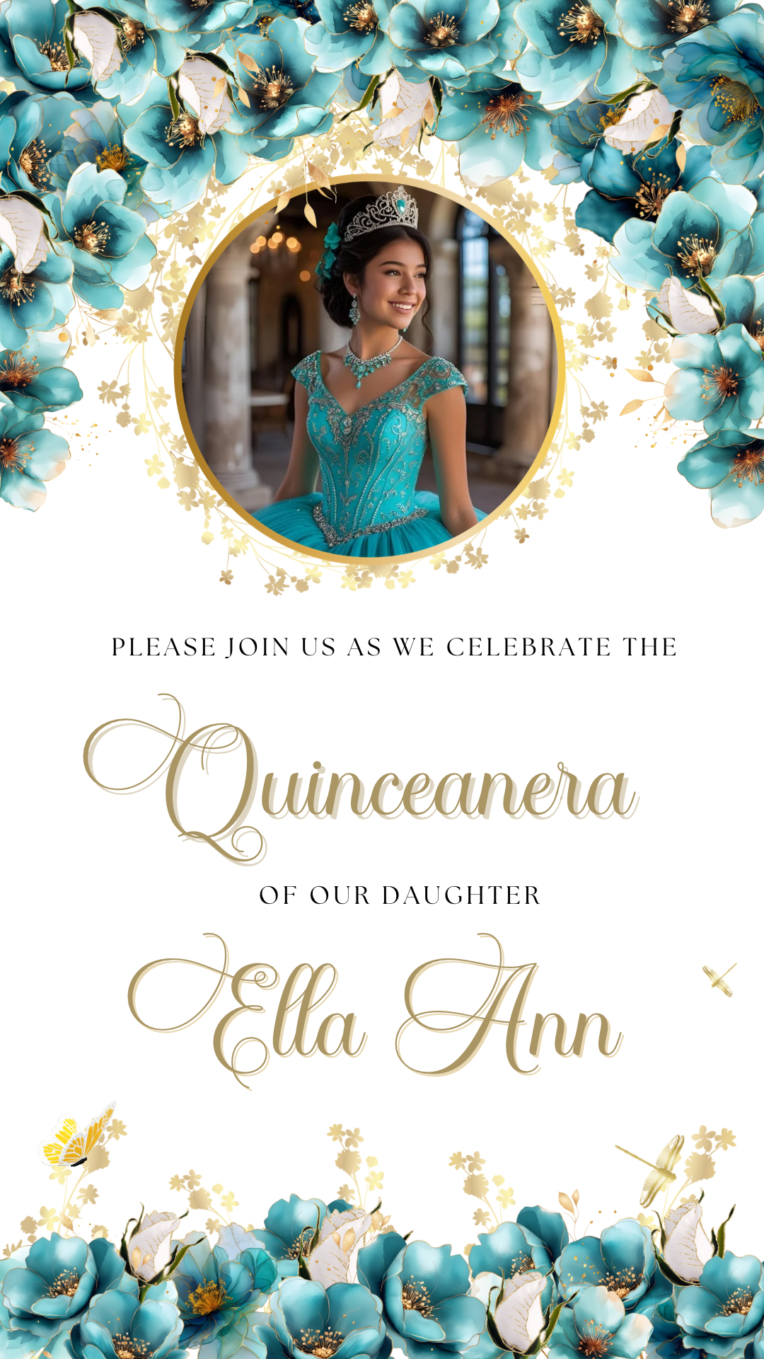 Turquoise and Gold Quinceanera Video Invite Animated Sweet 15 Quince Mobile Evite with RSVP tracking