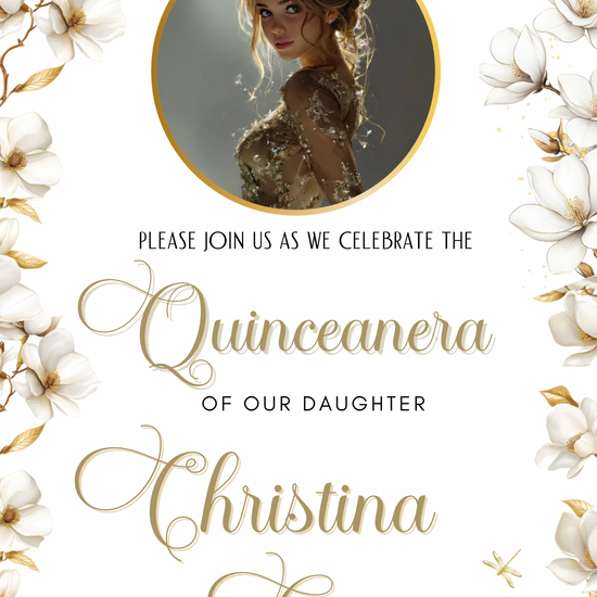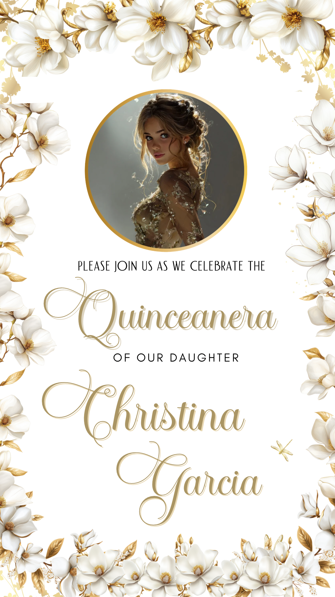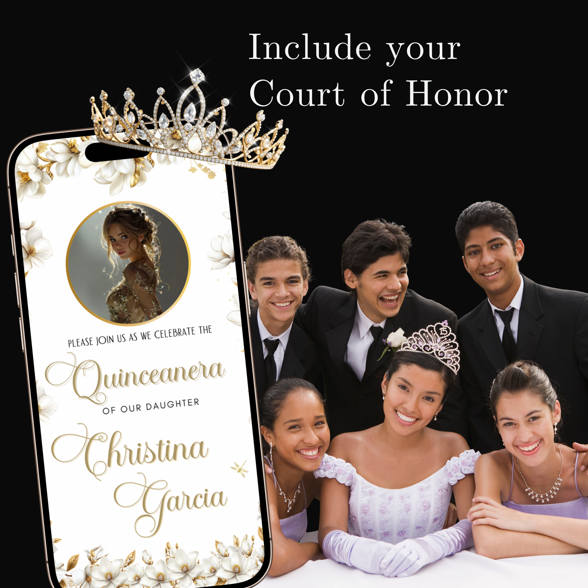 Give her a royal celebration with this White & Gold Quinceañera Video Invitation — an elegant, editable digital invite featuring golden crowns, shimmering florals, and a stunning princess gown. Includes a matching RSVP website so guests can reply instantly by text, WhatsApp, email, or social media.