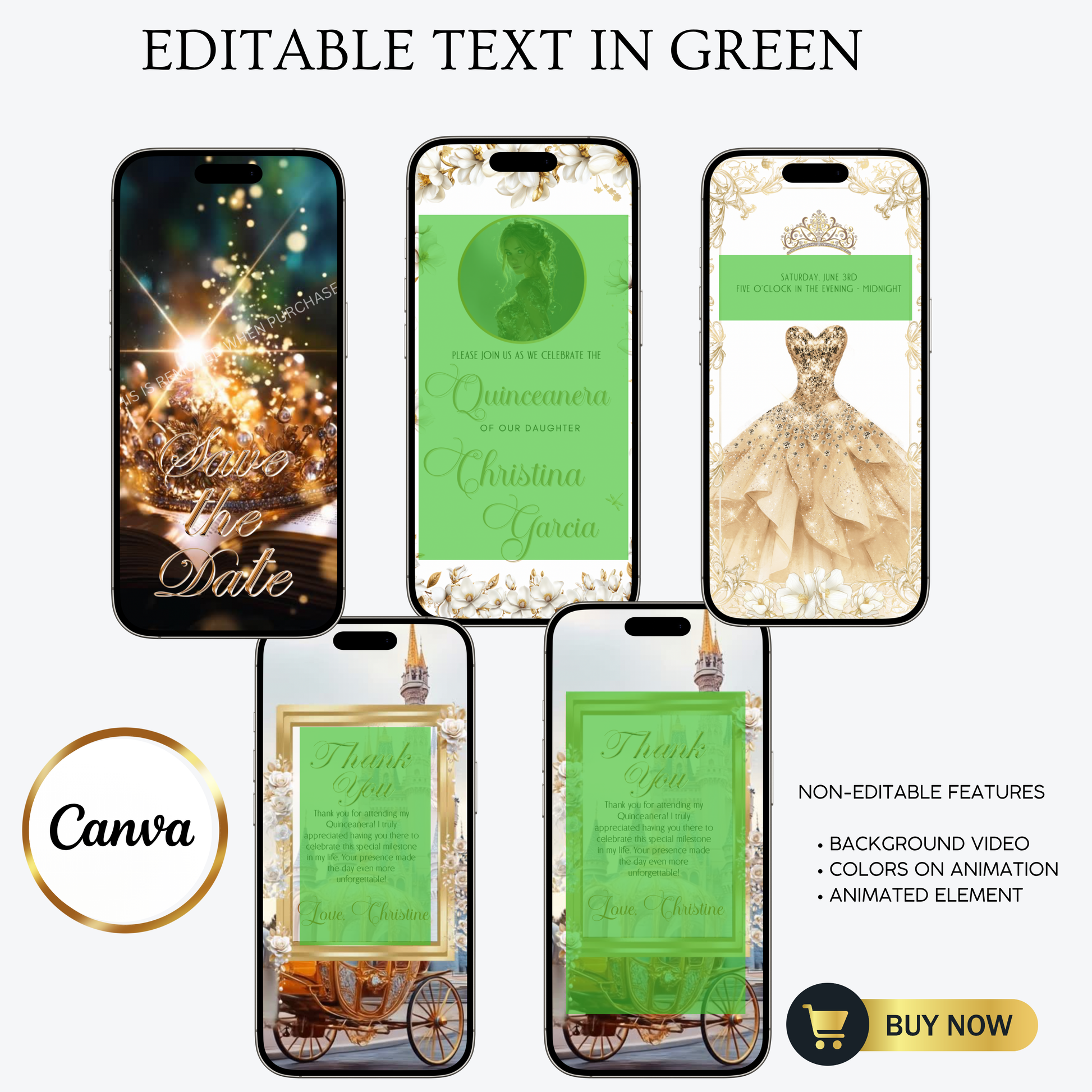 White and Gold Quinceañera Invitation | Royal Princess Video Invite with RSVP Website | Editable Canva Template | Elegant Gold Dress Sweet 16 Digital Evite